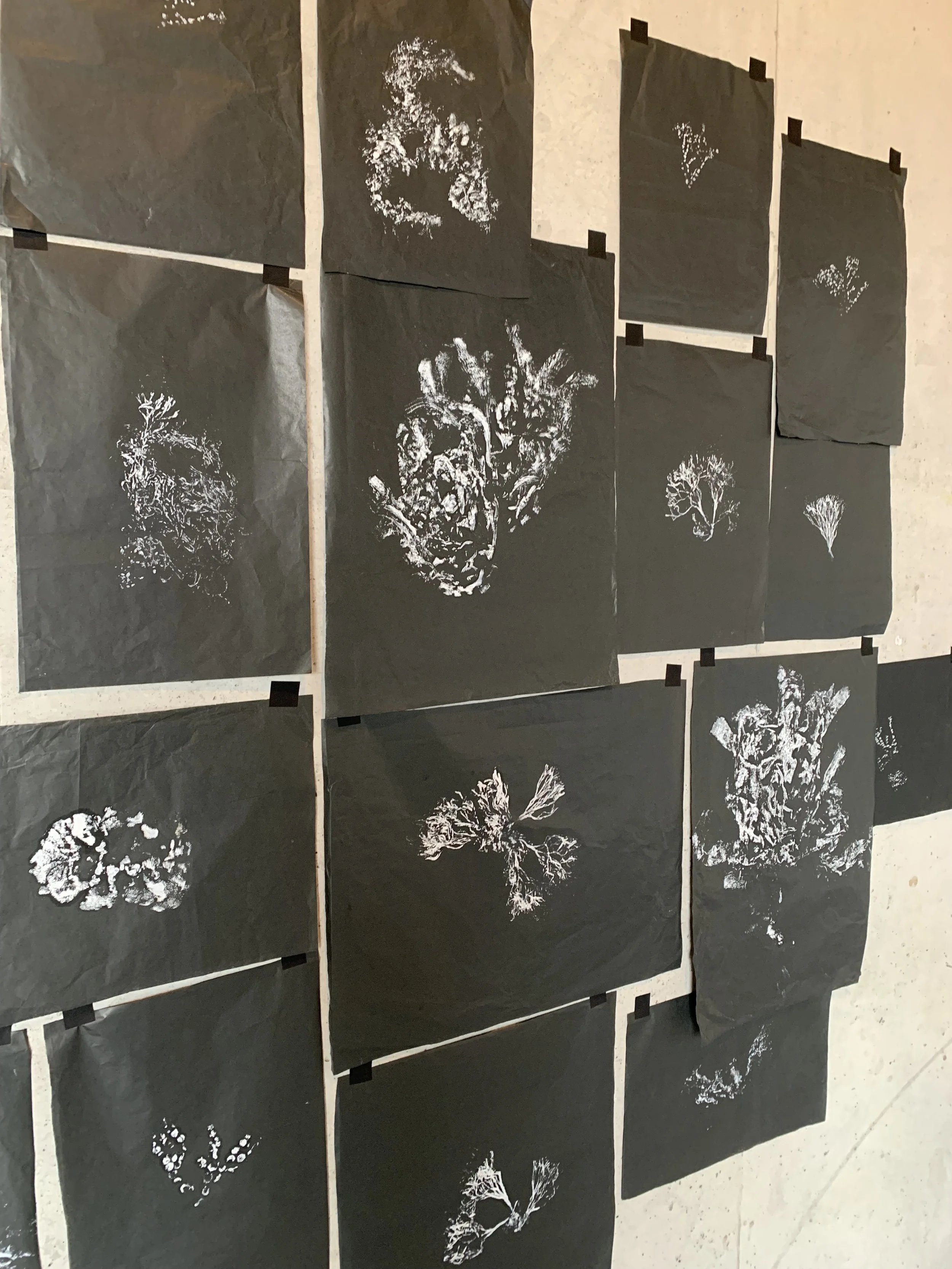 This project explores the movement of water and matter across the surface of paper, silk, concrete, and organic material in response to differing concentrations of solutes. They form altered visual relationships and changing axes. The charcoal paintings are vertical, cartographic, observed from afar, and detached - while other surrounding work is experienced as ‘embodied’. Down the side of a water tank in the centre of the room, fabric is swathed vertically from the rafters. The fabric has been drawn through liquid and charcoal. By using soft silk for the charcoal drawings, these float in a fluid motion. Attached to the wall is a series of drawings on paper, printed from the surface of the water and stamped at intervals with the fading remains. Charcoal paint covers horizontal paper where dripping water floods the surface. The surfaces shift and the materials are active. Water is an actant in our world.
